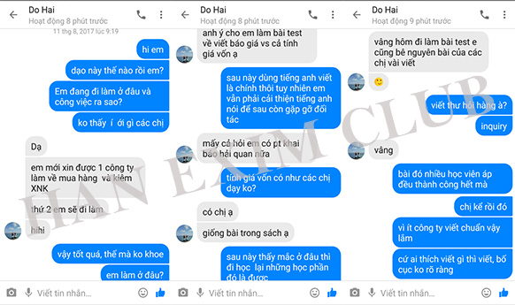 Câu chuyện của Hải là 1 tấm gương về việc “Có công mài sắt có ngày nên kim”, xuất phát điểm không có kiến thức về kinh tế nói chung và Xuất nhập khẩu nói riêng. Sau khi công tác tại một công ty về bảo hộ lao động tại Hà Nam, bạn đăng ký lớp Chủ nhật (học cả ngày) và chưa hề nghỉ buổi học nào. Đối với bạn mỗi buổi đi học thực sự quý giá vì bạn phải đi cả chặng đường dài. Kết quả là hiện bạn đang làm vị trí Mua hàng và Xuất nhập khẩu. Các bạn cùng xem phản hồi bạn ấy về kết quả buổi phỏng vấn bên dưới.