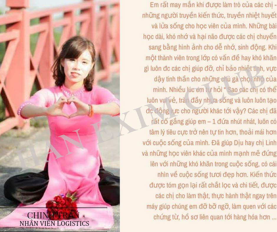 Ngày đầu tới lớp với đôi mắt ngơ ngác không rõ định hướng, lại rất rụt rè và ít nói. Tiếp xúc với cô bé mới biết em có rất nhiều nỗi sợ hãi, luôn thiếu tự tin về bản thân. Hiện tại, em Chinh đang làm việc rất tự tin và cứng cáp với vai trò là nhân viên chứng từ – khai báo hải quan cho công ty logistics.